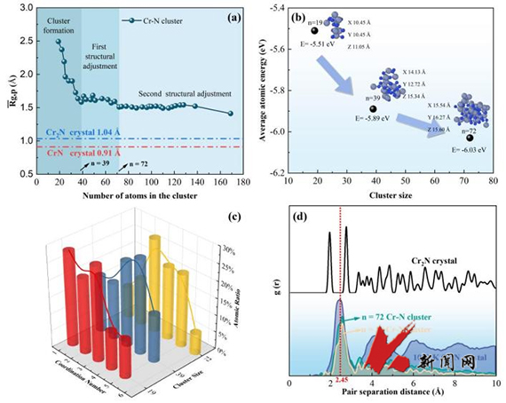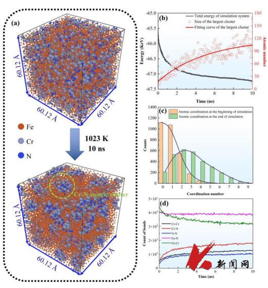 高氮奥氏体不锈钢以其卓越的潜在性能受到冶金材料研究人员的广泛关注。高氮不锈钢中氮元素含量高于传统不锈钢,在热加工过程中更易形成氮化物析出,导致出现基体贫铬区、贫氮区和Cr2N析出相,降低钢的强度和局部耐蚀性,对性能产生严重影响。团队使用LAMMPS分子动力学模拟了高氮奥氏体不锈钢热加工过程中氮化铬析出的微观结构演化和动力学,揭示了Cr2N相析出过程服从首先形成紧密Cr-N团簇亚稳中间相的二步形核机制,为优化设计高氮不锈钢中氮化铬析出控制提供了理论指导。