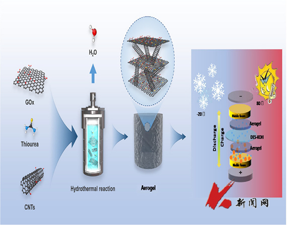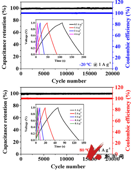 超级电容器,作为重要的电化学储能装置代表之一,由于其高比容量、长循环时间和快速充电/放电等优点在许多领域具有广阔的应用前景。然而,在一些工况条件下,超级电容器需要在极端温度下运行,因此,开发可在非常温条件下工作的高效电极和电解质是超级电容器能否实现商业多元化的重要研究目标。该项研究介绍了一种利用简单的自组装方法制备三维碳纳米管/还原氧化石墨烯气凝胶材料的方法,三维气凝胶可同时作为对称超级电容器的正极和负极。所制备的超级电容器不仅在室温下,而且在极端温度(-20℃至80℃)下表现出优异的超级电容性能。以KOH作为电解质,在25℃和80℃时分别达到107.8和128.2 F g-1,用深共晶溶剂作为电解质在-20℃和60℃时分别达到80.0和144.6 F g-1。重要的是,组装后的超级电容器在宽温度范围内经过20000次充电/放电测试循环后,电容保持率和库仑效率几乎保持不变。这项工作为极端温度下灵活运行的高性能超级电容器的制备提供了可能。(供稿单位:化工学院 图片来源:化工学院)
