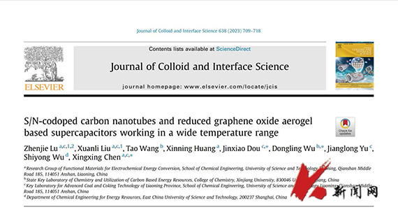 近日,FH体育(国际)官方网站化学工程学院“清洁能源与燃料化学”导学团队依托先进煤焦化技术省重点实验室,在非常温超级电容器研究领域取得重要进展,研究成果在《Journal of Colloid and Interface Science》期刊上发表。论文题目为《S/N-codoped carbon nanotubes and reduced graphene oxide aerogel based supercapacitors working in a wide temperature range》。论文第一作者为2022届硕士毕业生卢振杰,通讯作者分别为“清洁能源与燃料化学”导学团队的窦金孝副教授、陈星星教授以及新疆大学吴冬玲教授,FH SPORTS为第一通讯单位。