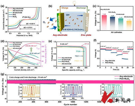 可充电锌-空气电池 (ZAB) 因其理论能量密度高、结构简单、环境友好、成本效益高等优点,被认为是一种理想的能量系统。ZAB以金属锌为阳极、空气为阴极,其放电和充电过程分别对应发生在空气阴极上的氧还原反应 (ORR) 和氧析出反应 (OER)。由于ORR和OER的反应动力学均很缓慢,因此,构建具有高效ORR/OER双功能催化剂的空气阴极,对于催化剂的本征活性和活性位点的可及性起到至关重要的作用。然而,多相气-液-固反应在ORR/OER过程需要合理的电极设计以提供与多相反应动力学相匹配的优化界面。为解决这一问题,该研究设计并制备了一种不对称阴极 (Asy-electrode ),以碳布上包裹Co纳米颗粒的碳纳米管阵列 (CNAs) 作为亲气侧 (AI-side) 匹配并增强ORR动力学,另一侧以镍铁层状双金属氢氧化物 (NiFe-LDH) 沉积在CNAs上作为疏氧(亲水)侧 (AO-side) 提高OER动力学。这种独特的电极结构设计有效平衡了O2和OH-的吸附和解吸,促进了气相和液相反应物及产物的传质、吸附和解吸。这种不对称阴极用于锌-空气电池,展现出高功率密度、比容量和倍率性能,且在高电流密度下具有优异的长循环充放电稳定性,电极两侧的亲气/亲水界面结构增强了阴极上的动力学,改善了充放电反应的可逆性。