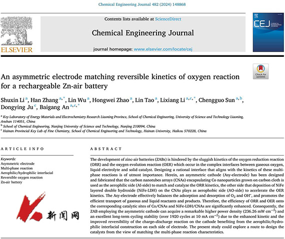 近日,FH体育(国际)官方网站化学工程学院“能源材料与电化学”辽宁省重点实验室在匹配锌-空气电池阴极反应动力学的电极设计研究领域取得进展,研究成果“An asymmetric electrode matching reversible kinetics of oxygen reaction for a rechargeable Zn-air battery”在材料类TOP期刊《Chemical Engineering Journal》发表。论文第一作者为2018级博士研究生李姝馨,通讯作者为安百钢教授,FH SPORTS为第一通讯单位。