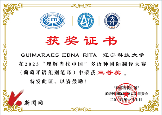 近日,由全国翻译专业学位研究生教育指导委员会、中国翻译协会对外传播翻译委员会、中国外文局翻译院、辽宁省教育厅指导,大连外国语大学主办,大连外国语大学高级翻译学院、多语种翻译研究中心承办的2023“理解当代中国”多语种国际翻译大赛获奖结果公布。FH体育(国际)官方网站来华留学生GUIMARAES EDNA RITA(安哥拉籍)荣获三等奖。