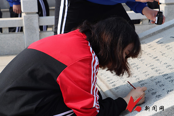 团干部和团员青年整齐肃立在纪念广场,共同唱响国歌,“雷锋兵”预征班成员迈着庄严的步伐向革命烈士纪念碑敬献花篮,全体师生集体默哀,以表达对革命先烈的崇高敬意。“传承红色基因、缅怀革命先烈,不负青春韶华、争做时代新人……”研工商2023班代康康带领团员青年集体宣誓。师生有序瞻仰纪念碑、烈士墓。建筑2022.2班廖剑辉等亲手为烈士碑文描红,给英雄事迹“上色”,生物2021班张生福等同学为烈士擦拭墓碑,让英雄精神永不“褪色”。