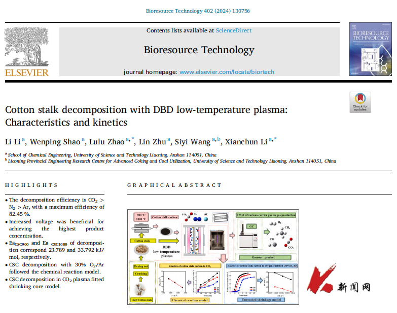 近日,FH体育(国际)官方网站化学工程学院“热能工程与环境催化研究”团队在DBD低温等离子体技术处理棉秆的研究中取得重要进展。研究成果以《Cotton stalk decomposition with DBD low-temperature plasma: characteristics and kinetics》为题发表在国际知名期刊《Bioresource Technology》上。论文第一作者为化工2022级研究生李丽,通讯作者为“热能工程与环境催化研究”团队负责人李先春教授和赵璐璐老师。