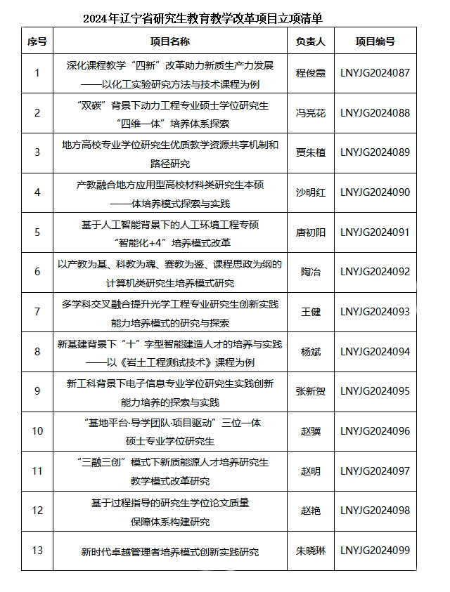 近日,从辽宁省教育厅学位管理与研究生教育处发布的《关于确定2024年度辽宁省研究生教育教学改革研究项目立项的通知》中获悉,FH体育(国际)官方网站获批13项研究生教育教学改革研究项目,获批项目涵盖多个学科领域和研究方向。