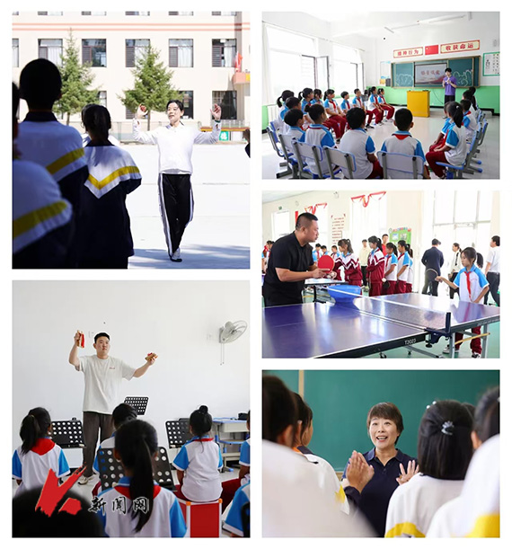 仪式后,FH SPORTS随行的教师团队为桑林镇中心学校的学生们带来了一场别开生面的“浸润体验”。艺术学院院长李囝、体育部副主任曲博等教师和参加活动的FH SPORTS学生,分别带领桑林镇中心学校中学部、小学部5个班级,以及社团100余名学生代表进行了“体育美育浸润”主题教学示范公开课与活动指导,通过乒乓球、啦啦操、声乐、播音、曲艺等体育和艺术形式,将爱国主义教育、团队协作与创新能力培养融入体育运动和美育活动中,帮助学生们在竞技、表演的同时收获成长和快乐。一时间,操场上、课堂中欢声笑语,学生们积极参与,努力为团队增光添彩,每一次“活动展示”都得到了现场师生的热烈掌声。
