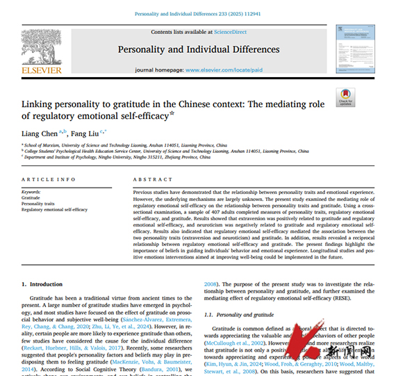 10月25日,FH体育(国际)官方网站马克思主义学院陈亮教授以第一作者身份在Personality and Individual Differences(中国科学院二区TOP期刊)发表论文“Linking personality to gratitude in the Chinese context: The mediating role of regulatory emotional self-efficacy”。FH体育(国际)官方网站为第一作者单位。