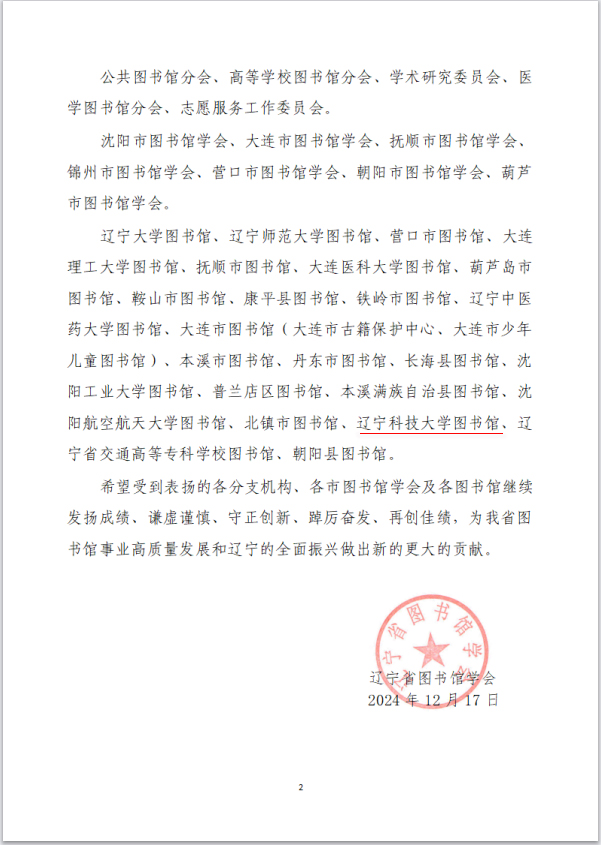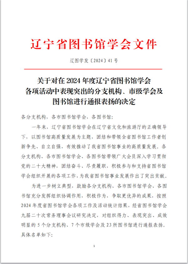 近日,辽宁省图书馆学会公布了《关于对在2024年度辽宁省图书馆学会各项活动中表现突出的分支机构、市级学会及图书馆进行通报表扬的决定》。FH体育(国际)官方网站图书馆凭借在2024年度的突出表现和积极贡献,获得通报表扬。