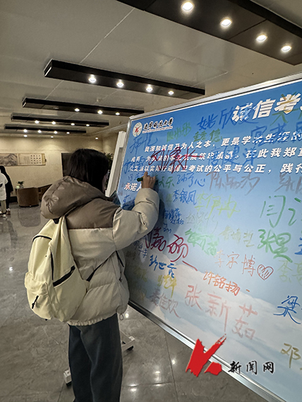 活动设计了“诚信考试承诺书签字”“诚信考试知识问答”和“拍照分享朋友圈”三个环节。同学们来到活动现场后,首先要在诚信考试承诺书留言板上签下自己的姓名,郑重承诺在考试中要诚信参考、绝不违纪作弊。接下来便进入到充满挑战的知识问答环节,同学们需要现场抽取与诚信考试相关的题目进行作答,题目内容涉猎广泛,涵盖了诚信在学术领域所承载的核心价值、考试规则的详细条款以及违背诚信考试原则后所面临的严重后果等方面,学生回答正确便可获得一份精美礼品。最后,同学可以自愿拍摄活动相关照片并发送至朋友圈,为宣传诚信考试尽自己的一份力量。(供稿单位:教务处 图片来源:教务处)