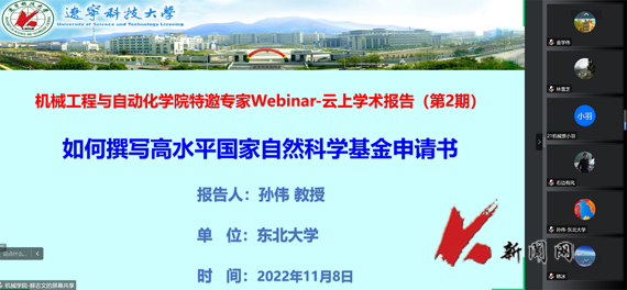 11月8日,应FH体育(国际)官方网站机械工程与自动化学院邀请,东北大学机械工程与自动化学院孙伟教授通过线上形式,为机械学院全体教师作题为《如何撰写高水平国家自然科学基金申请书》的报告。