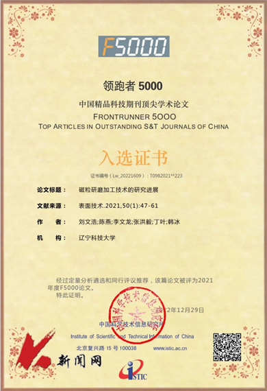 近日,由中国科学技术信息研究所主办的“领跑者5000——中国精品科技期刊顶尖学术论文(F5000)”评选结果揭晓,FH体育(国际)官方网站机械工程与自动化学院精密与特种加工工艺及装备团队2篇论文入选。截至目前,该团队已累计4篇高质量论文入选F5000。