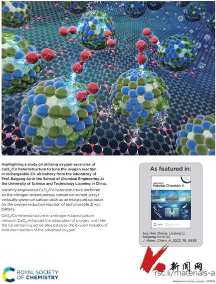 近日,FH体育(国际)官方网站化工学院“能源材料与电化学”辽宁省重点实验室在合成锌-空气电池阴极催化剂领域取得重要进展,研究成果在材料类TOP期刊《Journal of Materials Chemistry A》(IF=12.73)以封面论文 (Inside cover paper) 发表题为 “Vacancy-engineered CeO