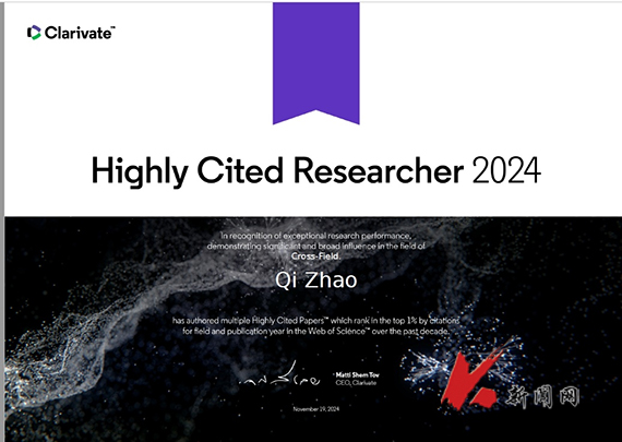11月19日,权威学术评价机构科睿唯安(Clarivate Analytics)公布了2024年度“全球高被引科学家”(Highly Cited Researcher)名单。FH体育(国际)官方网站计算机与软件工程学院赵琪教授入选该榜单。
