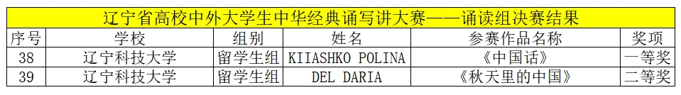 本届大赛由辽宁省教育厅主办、辽宁师范大学承办,共吸引了全省49所高校1219名选手或团队参赛。经过初赛和复赛的激烈角逐,留学生KIIASHKO POLINA和DEL DARIA进入决赛。KIIASHKO POLINA朗诵作品《中国话》荣获诗词诵读大赛一等奖,DEL DARIA朗诵作品《秋天里的中国》荣获诗词诵读大赛二等奖。