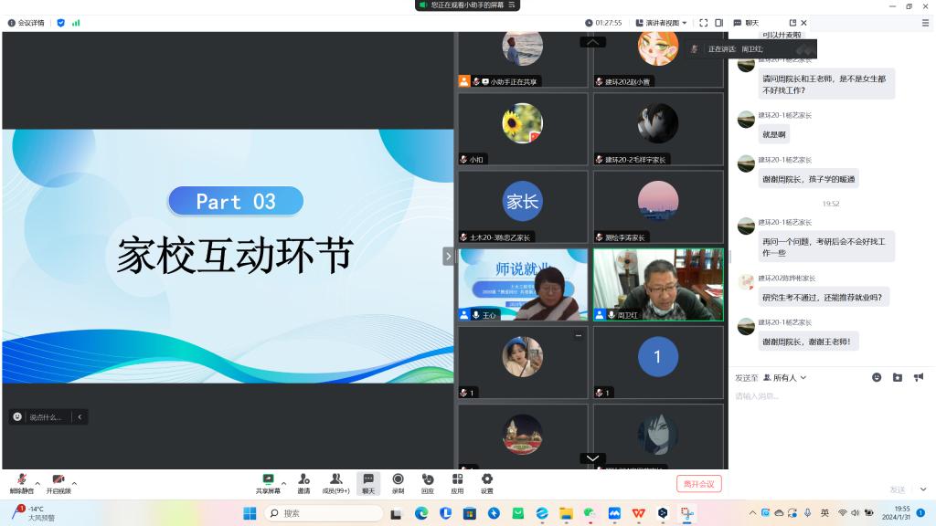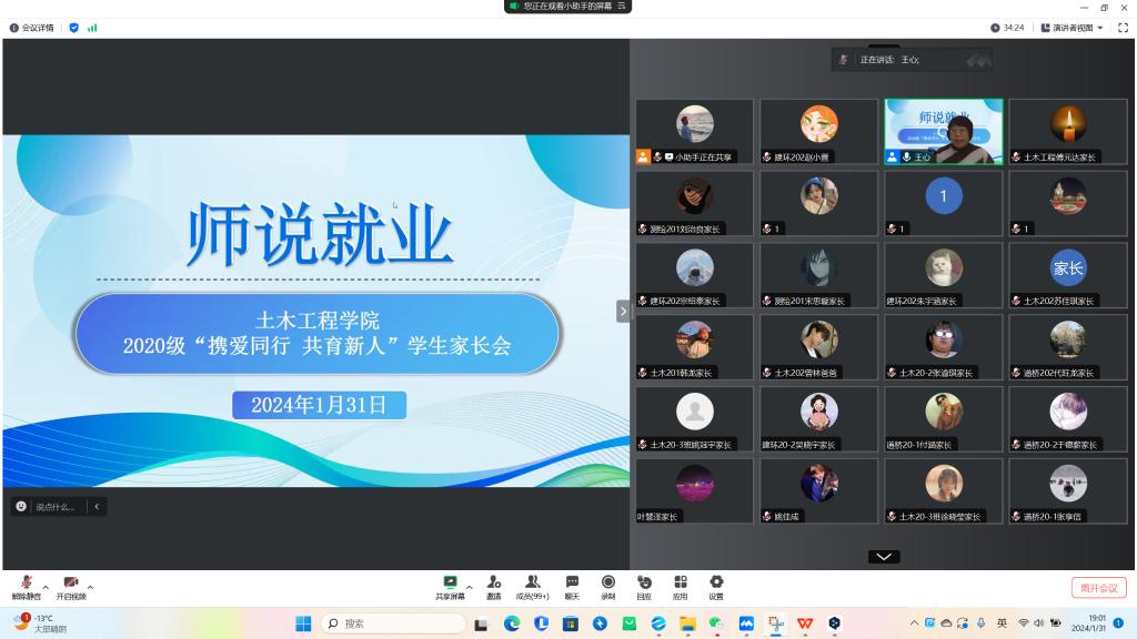 2月1日,FH体育(国际)官方网站土木工程学院“家校共育,共促就业”家长会于线上召开,学院院长周卫红教授应邀出席并围绕职业生涯规划和就业指导等内容展开宣讲,2024届毕业班辅导员、全体毕业生及家长参加会议。