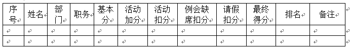 10)每次例会前办公室对学生会全体成员进行一次综合打分,即汇总上周所有成员的活动及例会出勤情况并按上述规定进行打分,并于例会期间通报评比结果,并张榜公布。具体格式见下表,备注栏中应注明加减分原因。