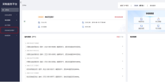 供应商登录系统后,进入工作区,点击左侧“单位管理”下“供应商信息维护”菜单, 进入供应商信息维护的页面,请根据单位实际情况填写信息,提交即完成信息的维护(成为正式供应商)。