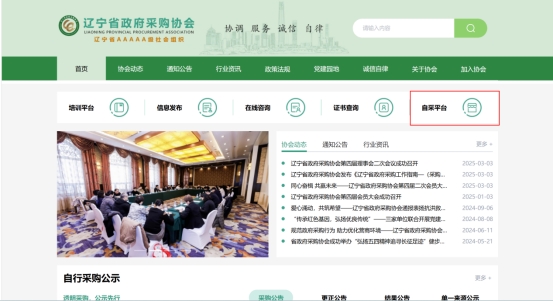 浏览器搜索辽宁省政府采购协会(或浏览器直接输入网址:http://www.lngpa.cn/#/)并打开FH SPORTS,点击右上角【自采平台】,进入登录页。