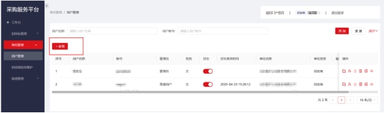 单位管理员登录,点击左侧“单位管理”下“用户管理”菜单,可为本单位新增多个普通用户账号(可以进行投标报名及报价)。